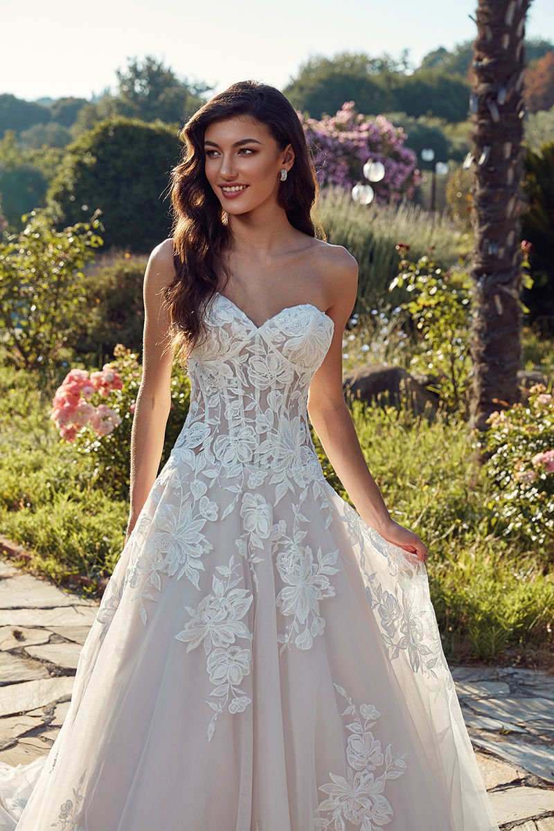 Izzie by Eddy KGown InformationFit-n-Flare gown in ivory crepe with corset bodice, off shoulder swag sleeves, basque waist, buttons to end of train.